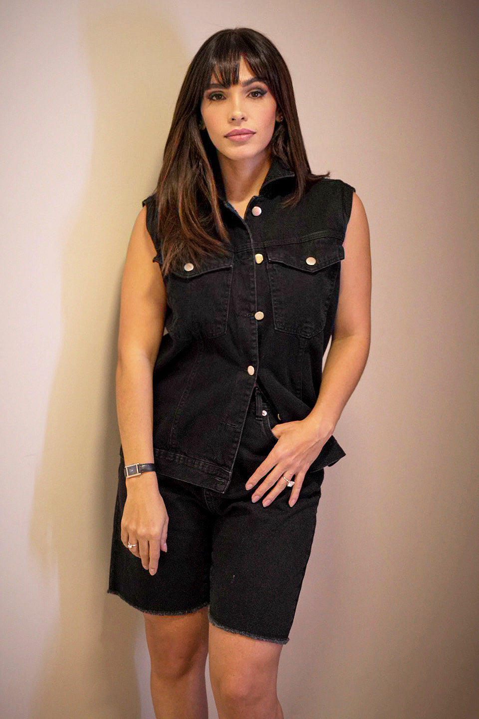 Aquela peça 2 em 1 cheia de charme e estilo. Uma jaqueta com lavagem black que vira um colete ( as mangas são removíveis), dando a você inúmeras possibilidades de produções incríveis e nada óbvias.