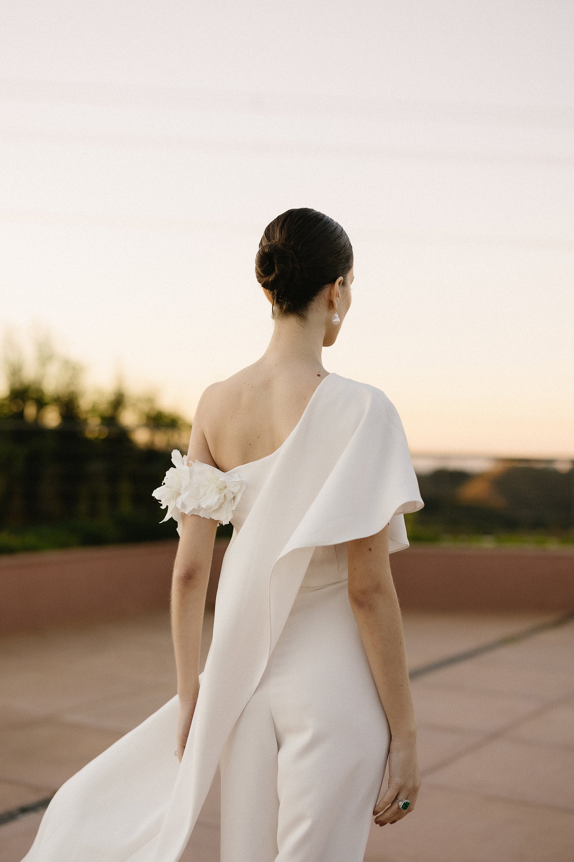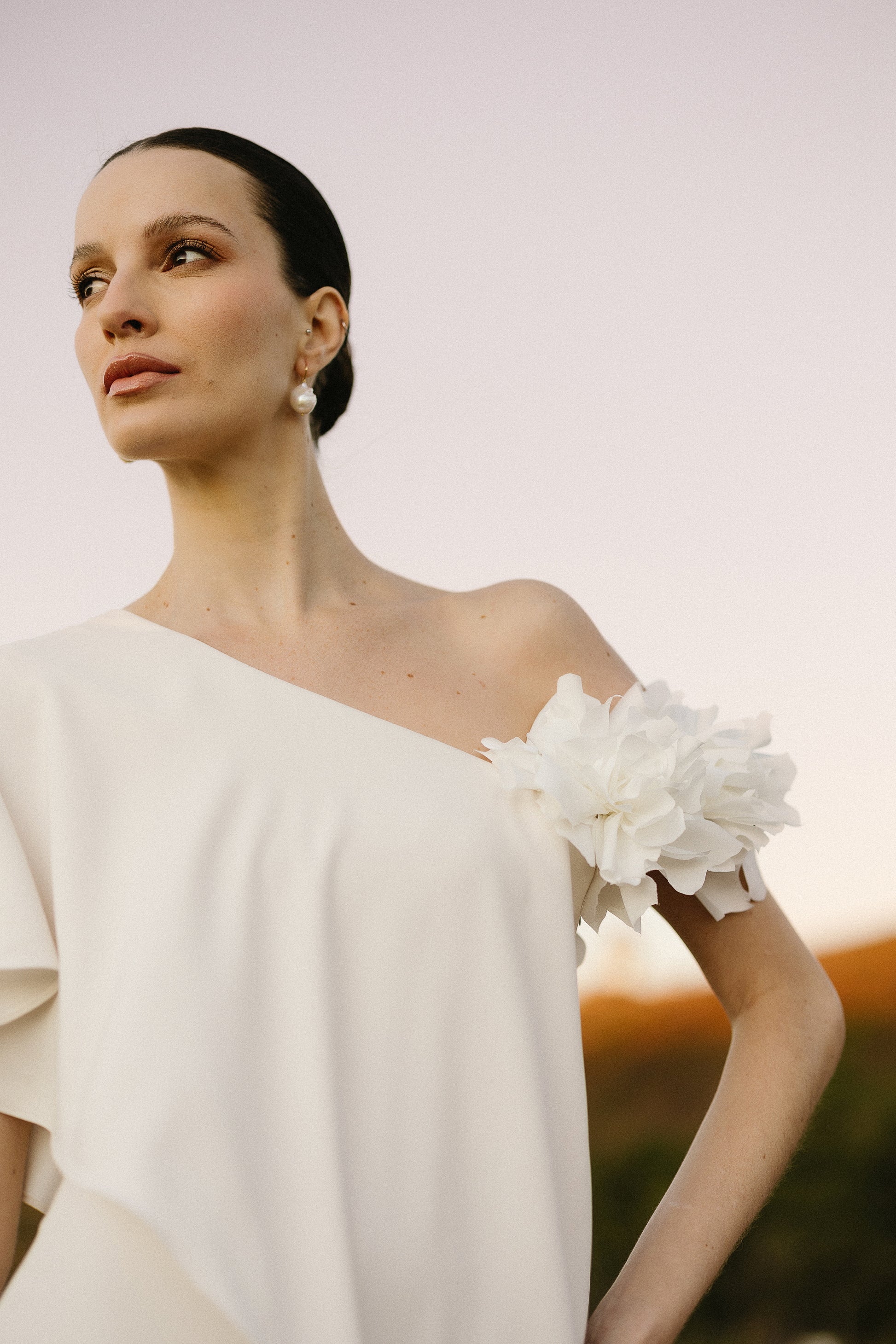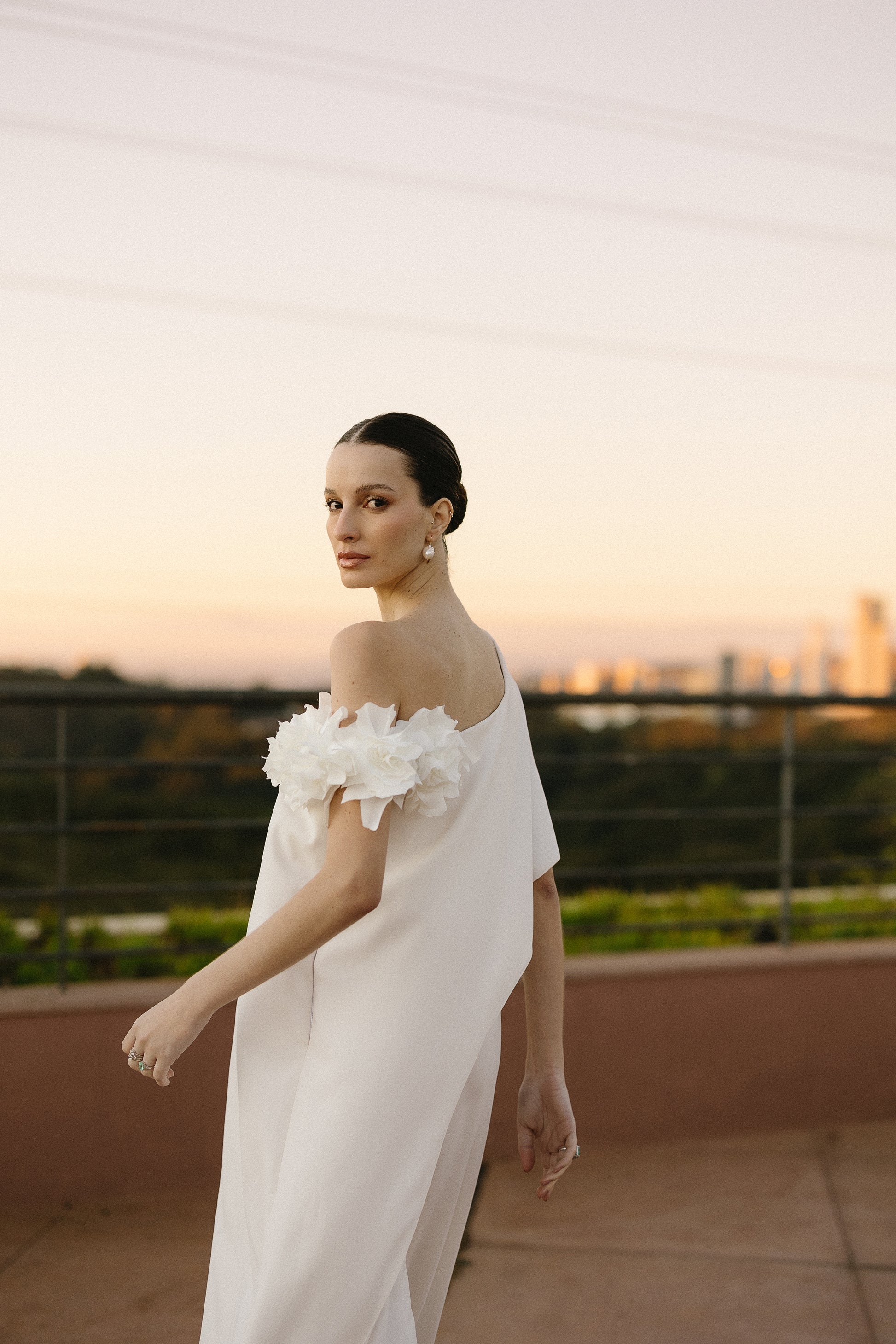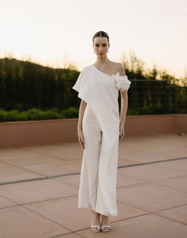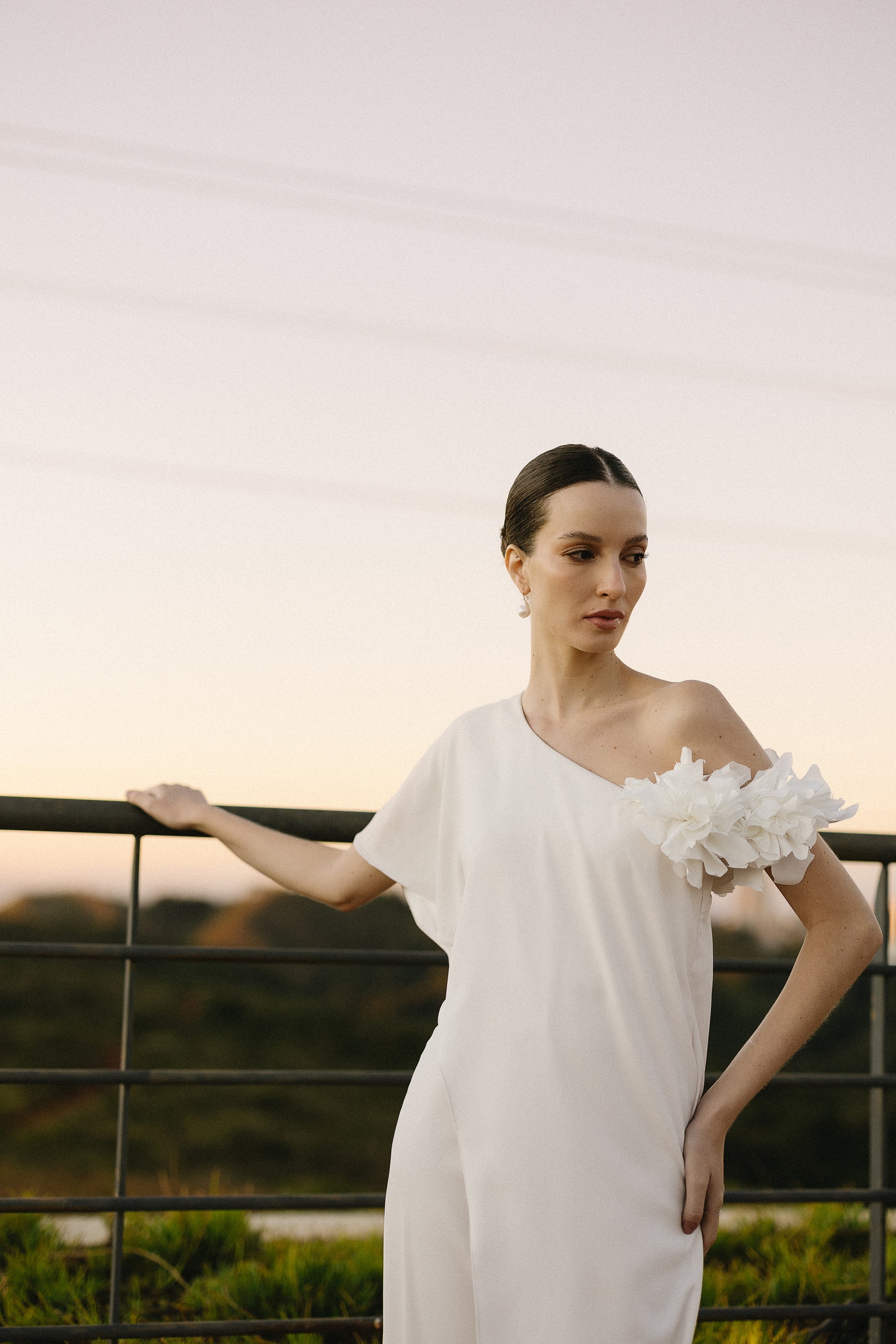 Macacão de crepe modelo um ombro só, detalhe de flores feitas à mão.
