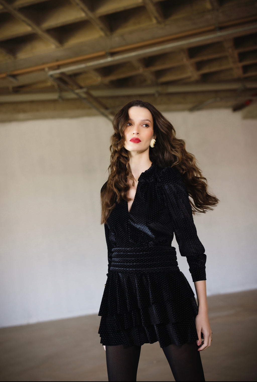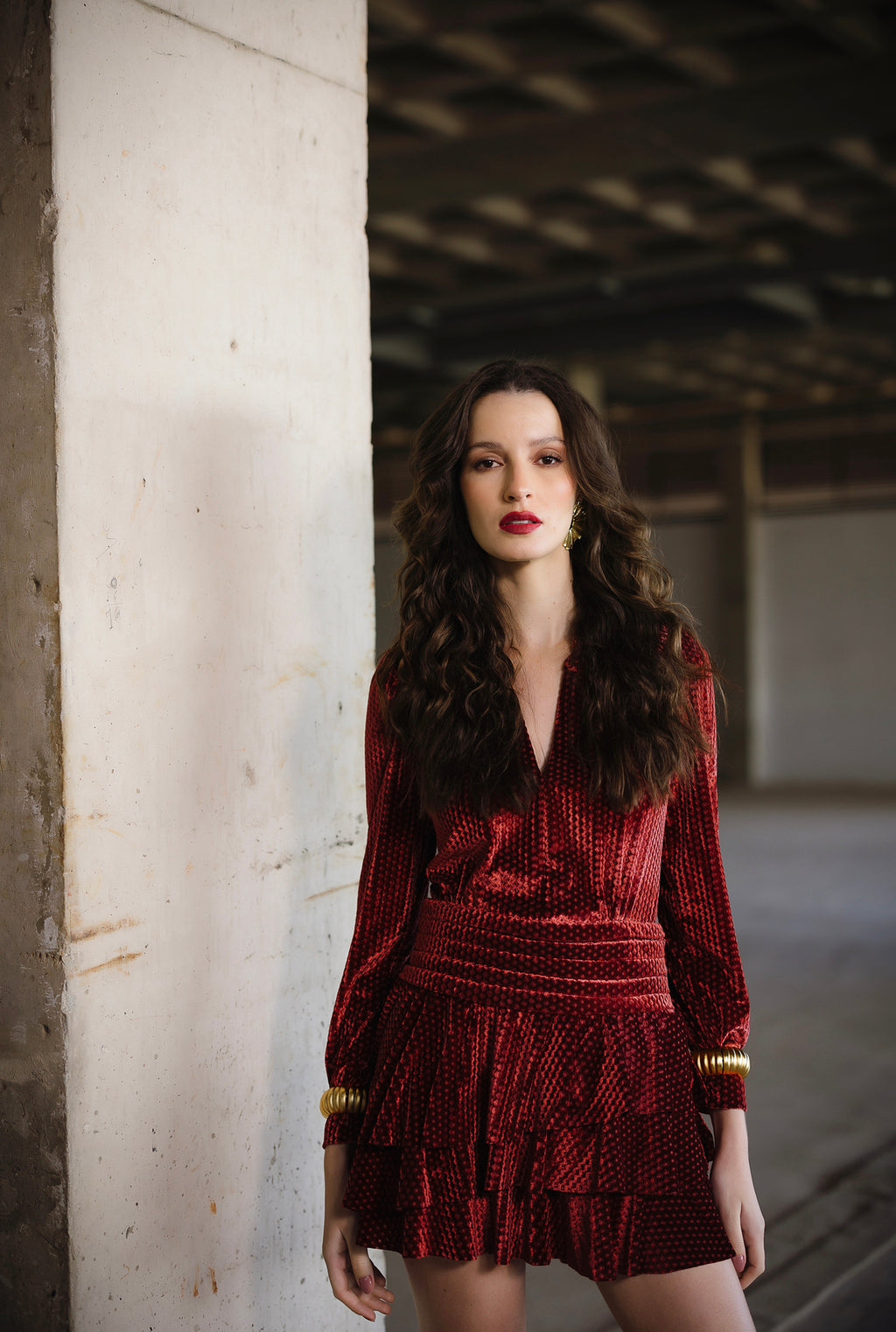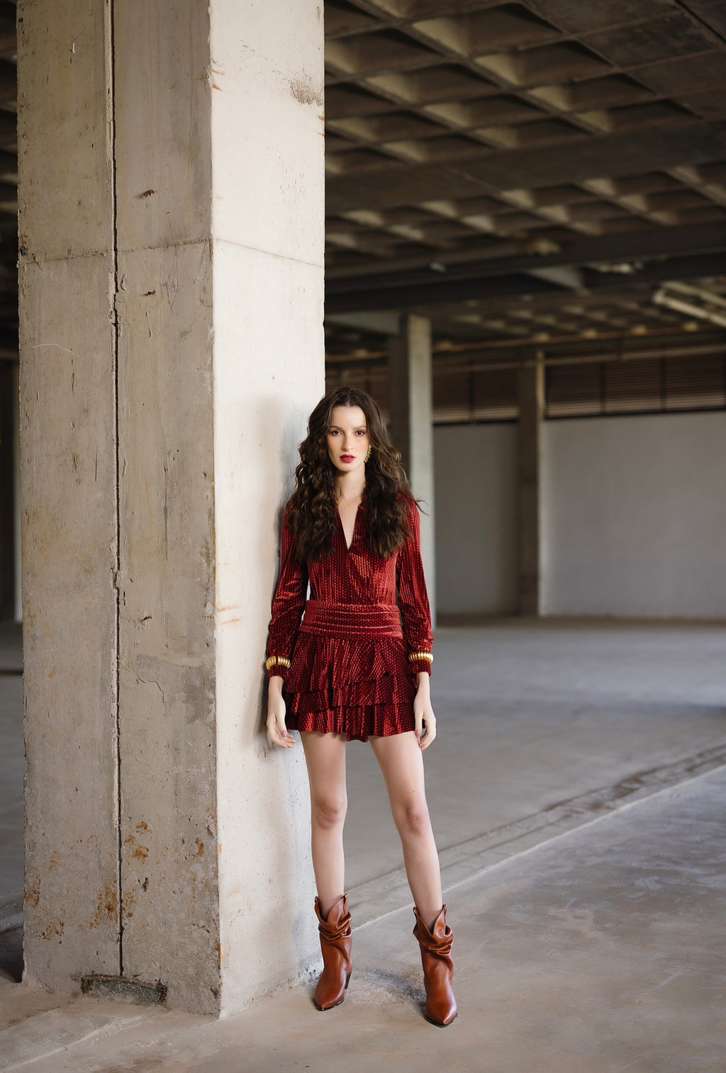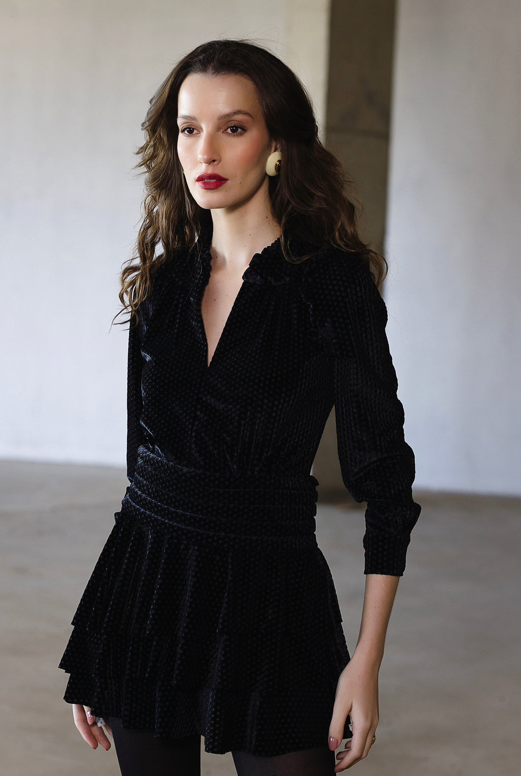Confeccionado em veludo exclusivo texturizado, o vestido possui modelagem evasê, caimento reto, decote em V com franzidos, mangas cumpridas bufantes com franzidos, drapeado na cintura, camadas com babados e franzidos assimétricos, comprimento curto, acabamento pespontado e fechamento lateral por zíper invisível.