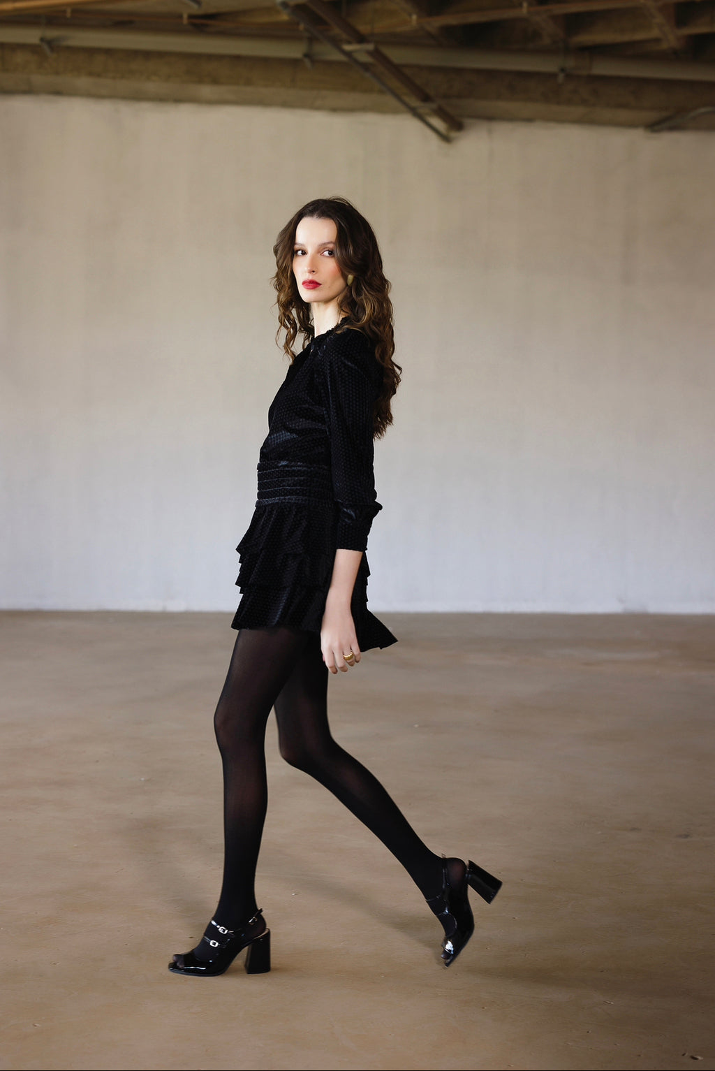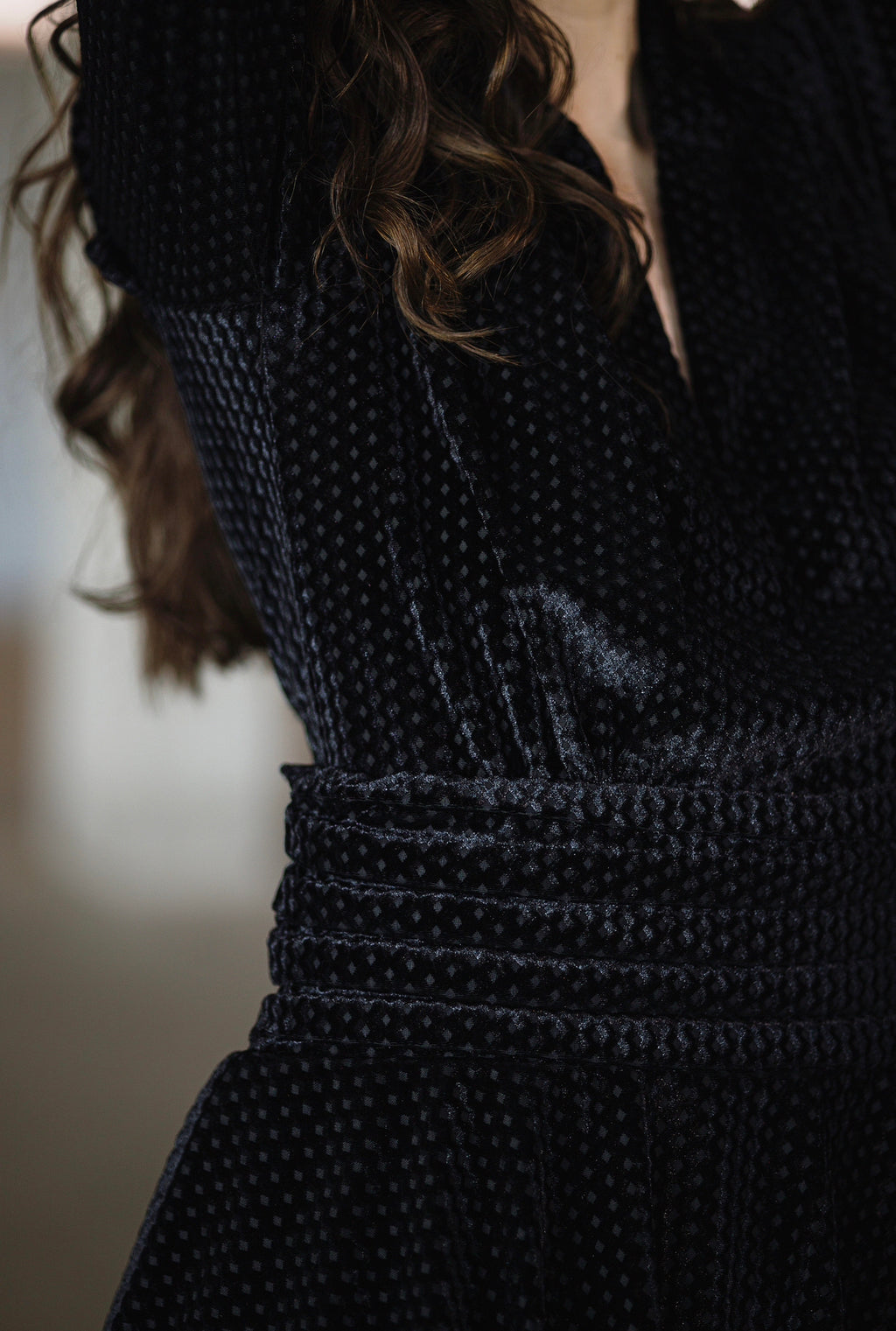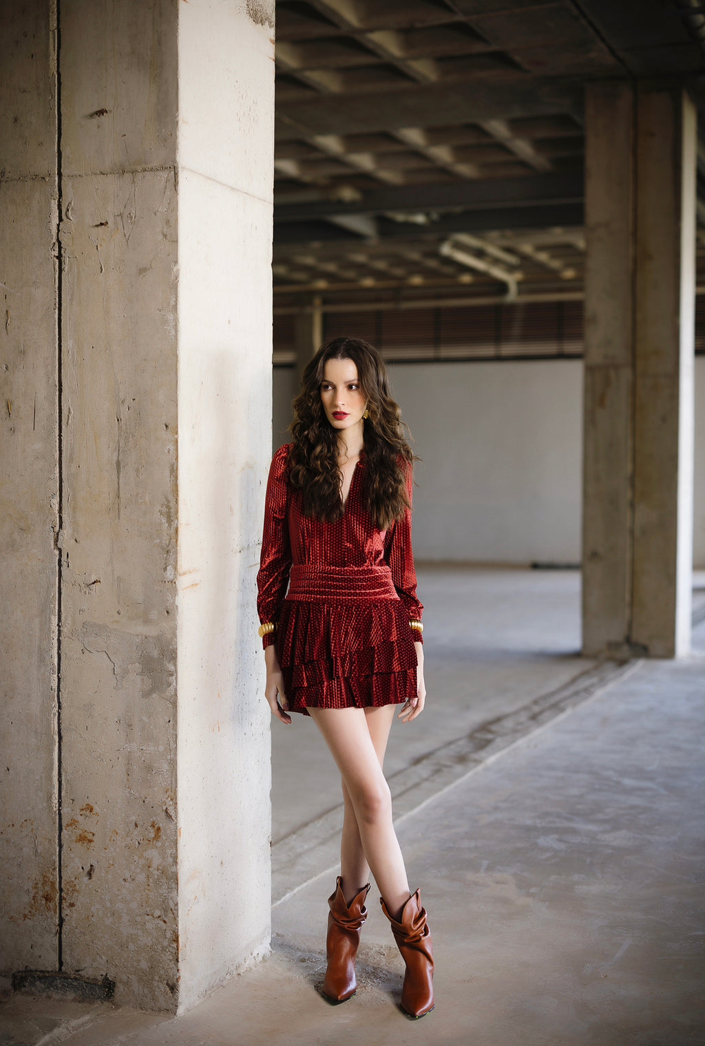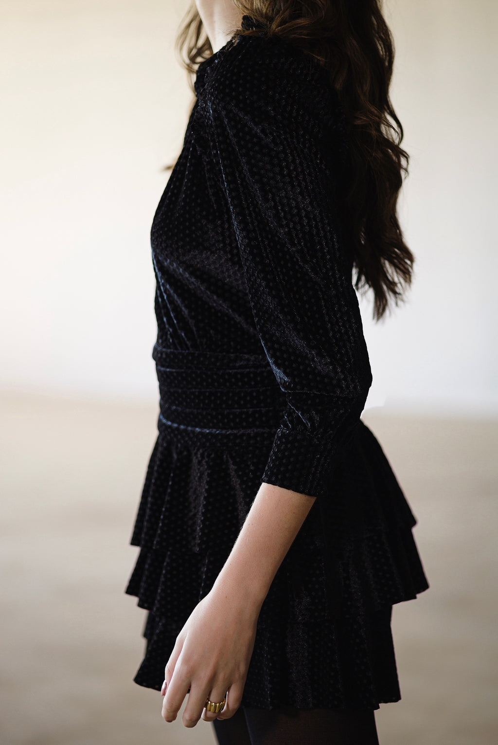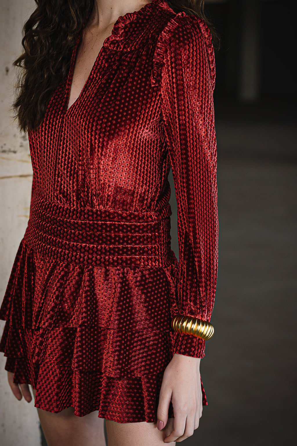 Confeccionado em veludo exclusivo texturizado, o vestido possui modelagem evasê, caimento reto, decote em V com franzidos, mangas cumpridas bufantes com franzidos, drapeado na cintura, camadas com babados e franzidos assimétricos, comprimento curto, acabamento pespontado e fechamento lateral por zíper invisível.
