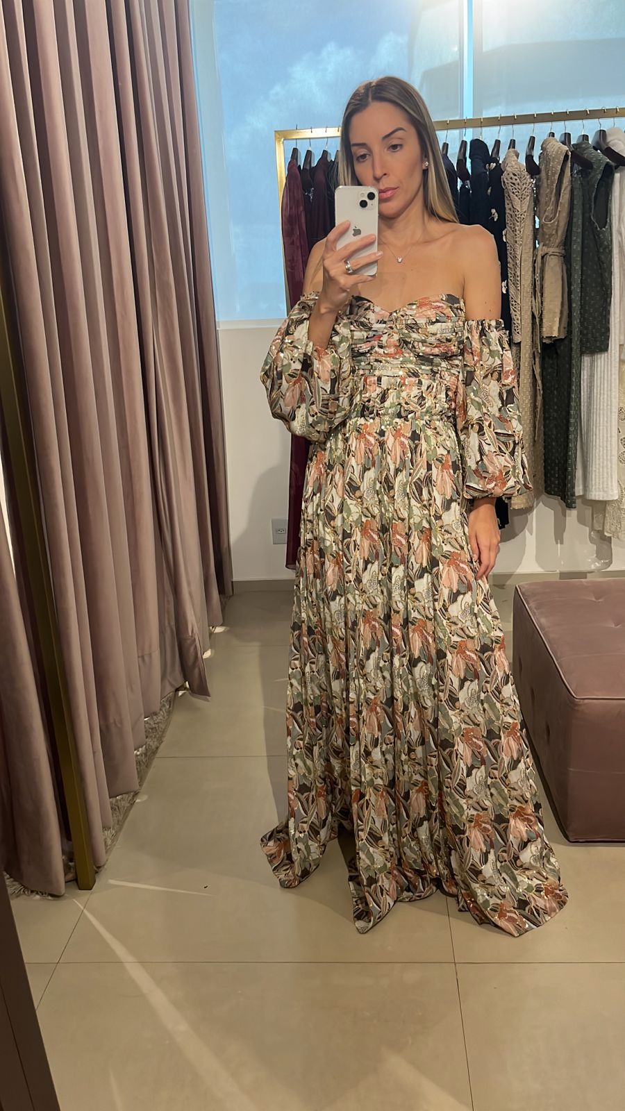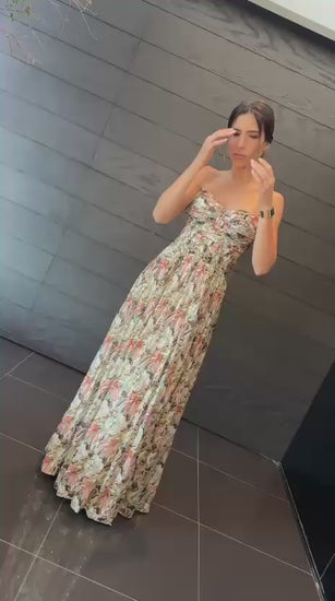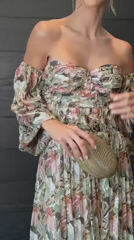 Vestido longo em chiffon estampado com micro paetês bordados. O corpinho estruturado com plissado tomara-que caia oferece a opção para usar com ou sem mangas bufantes.