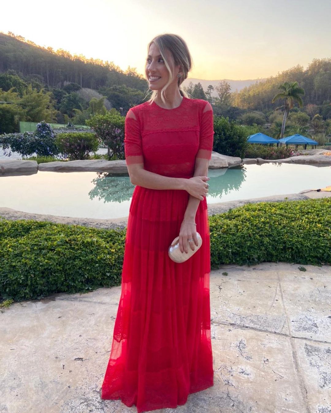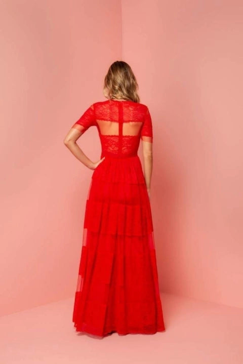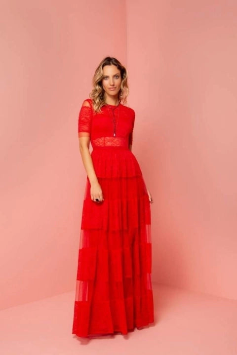 Vestido todo em tule com mix de renda chantilly.