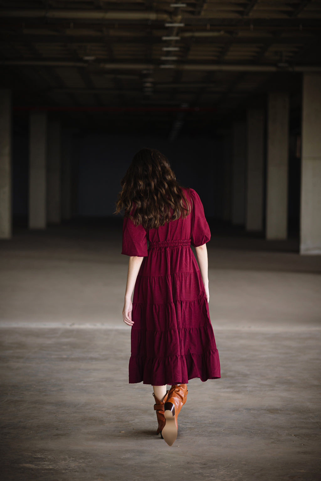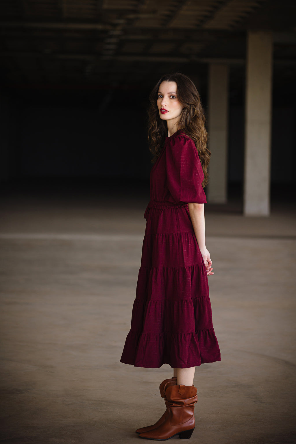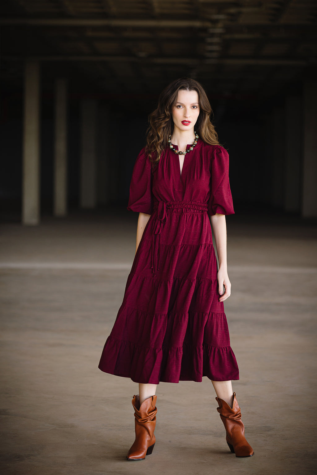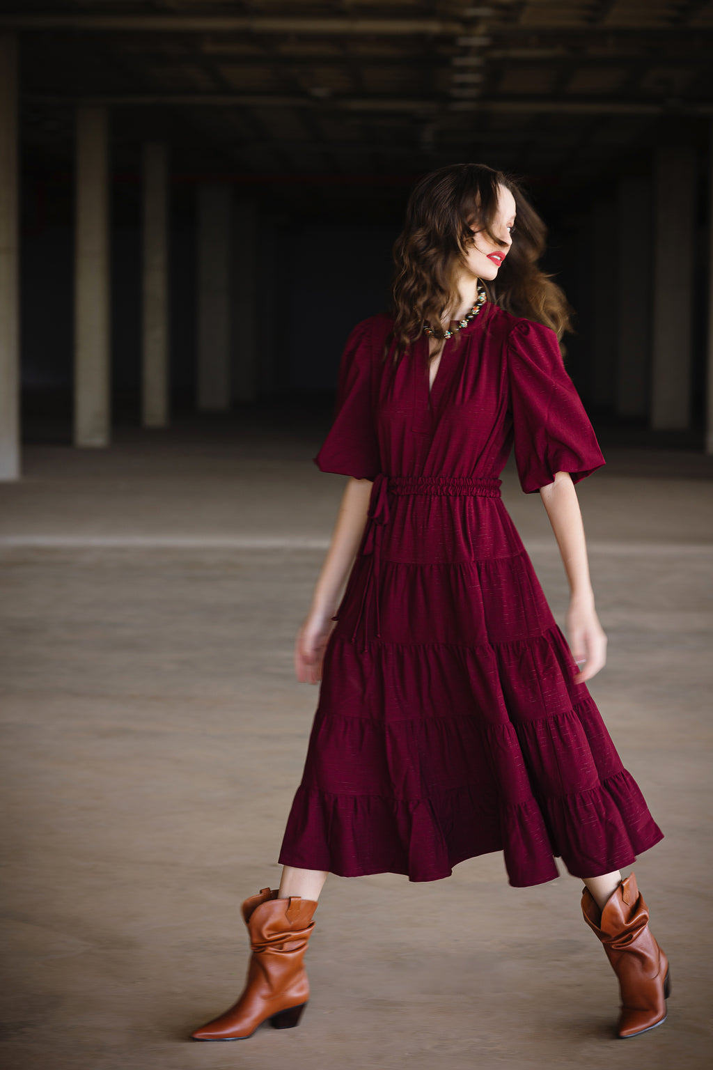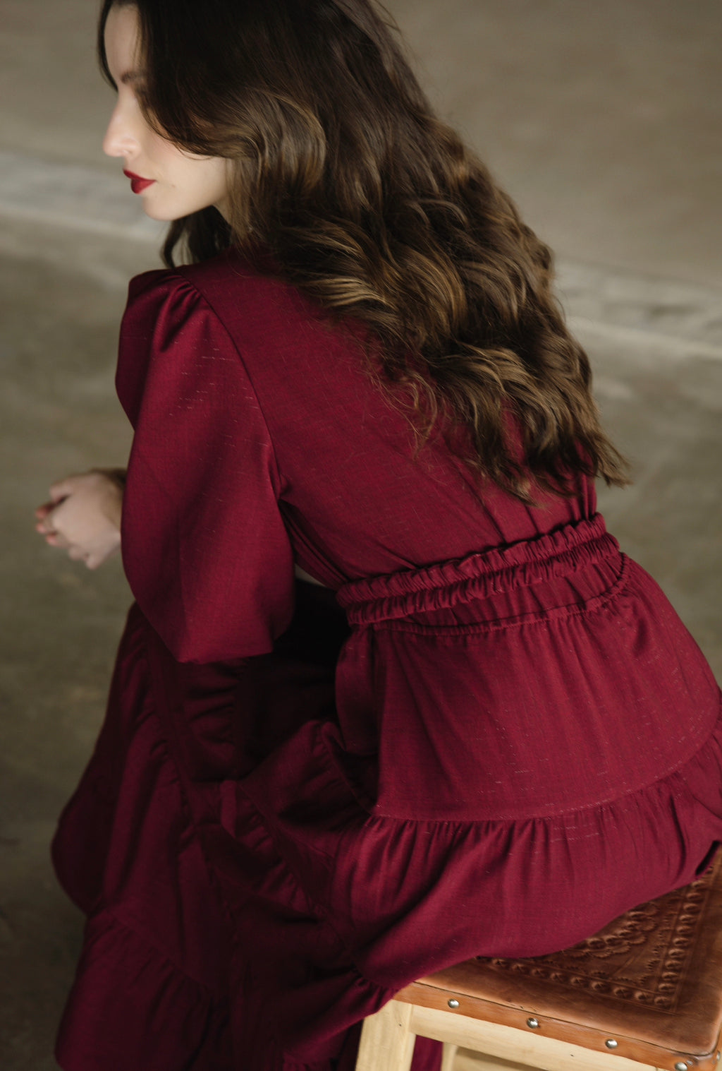 Confeccionado em 95% poliéster e 5% elastano com fios levemente metalizados, o vestido possui modelo evasê, caimento acinturado, decote em V, mangas bufantes 3/4, regulagem na cintura, camadas com babados e franzidos, comprimento midi e acabamento pespontado. Possui um cinto de amarrar do próprio tecido avulso.